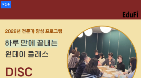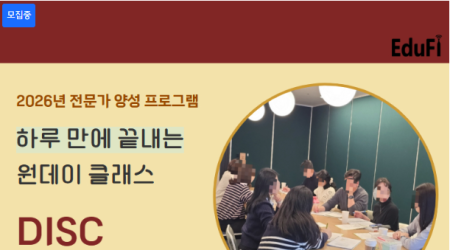 안녕하세요!모두가 함께 나누는 교육의 즐거움에듀파이교육센터입니다 :-)2026년 DISC 행동유형 강사양성과정의 원데이클래스의 심화 과정인 DISC 강사양성과정 2일반 수강생 모집 안내드립니다.DISC 1일 기본반으로 아쉬움을 가지는 분들을 위한 실전강의+생성형 AI 활용 실습 과정을 포함한 2일 과정입니다.[1기] 2…